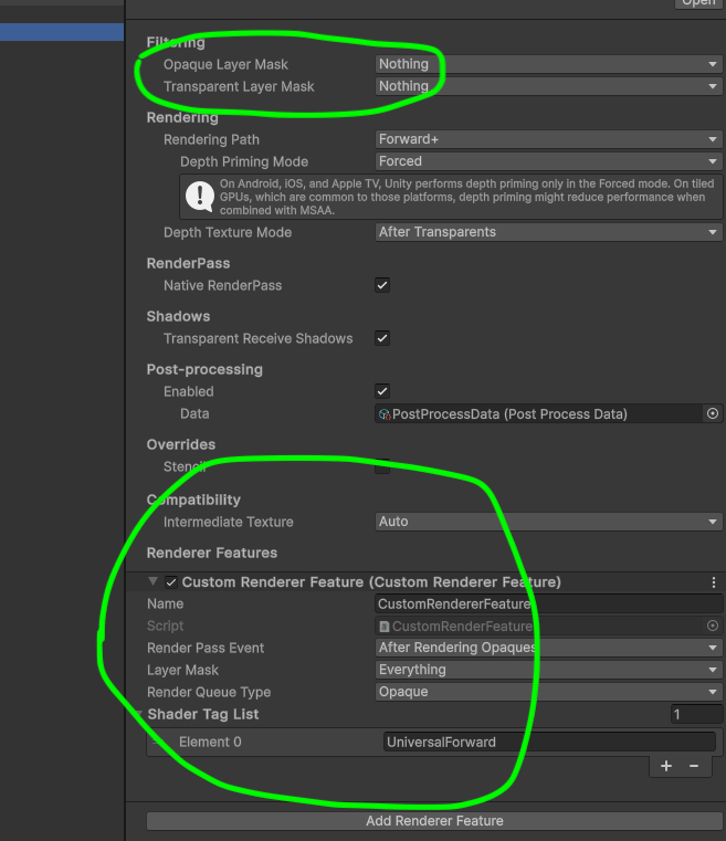 - RendererFeature는 기존 구현과 RenderGraph 지원 이후에도 동일하게 다음과 같이 사용합니다.
