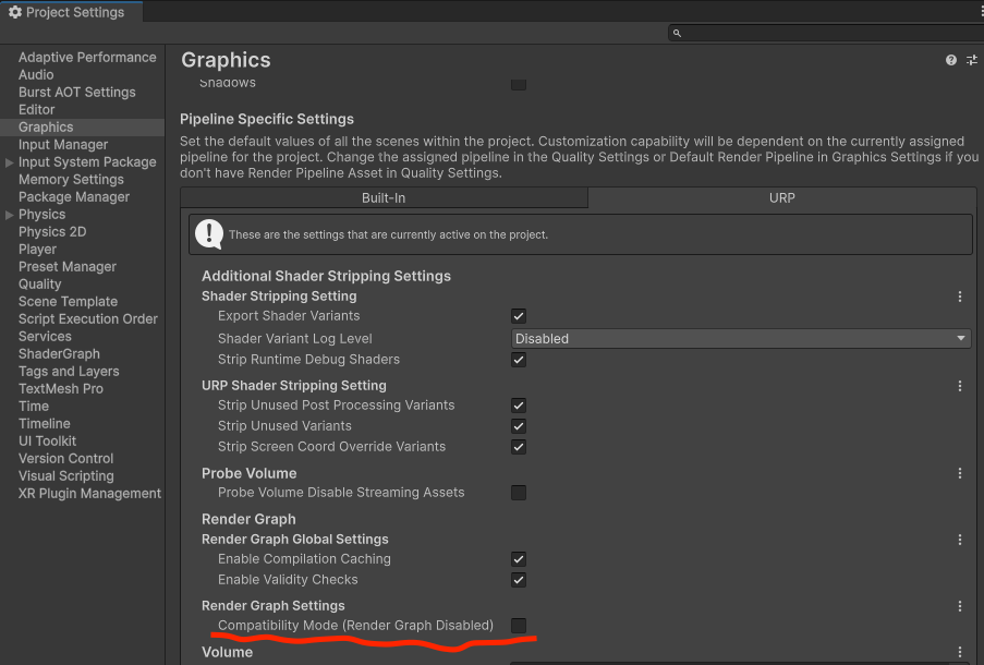 - RenderGraph를 활성화해야 하며, ProjectSettings>Graphics>URP의 Render Graph Settings>Compatibility Mode (Render Graph Disabled)의 체크를 해제한다.