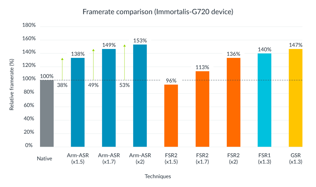 - Arm ASR: 모바일 디바이스에서 GPU 사용량을 줄이고 배터리 수명을 연장하는 데 중점을 둡니다. Arm의 내부 테스트에 따르면, 동일한 해상도와 스케일링 팩터에서 ASR은 FSR2에 비해 최대 1.5배 더 빠른 GPU 성능을 제공합니다.