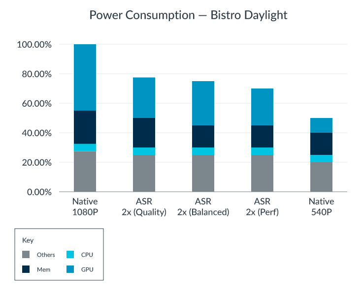 기본 전체 해상도(1080p), Arm ASR 품질, 540p에서 1080p로의 밸런스 및 성능 업스케일링, 기본 절반 해상도(540p)를 위한 전력 소비량.