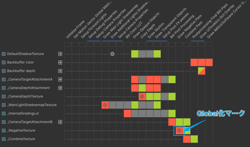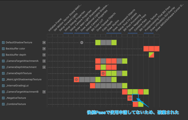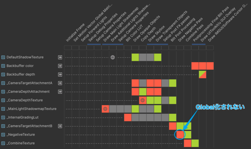 - RenderGraph는 드로잉 단계에 들어가기 전에 모든 드로잉 패스가 신청한 텍스처를 체크하여 각 텍스처의 폐기 시점을 결정하고, 텍스처는 후속 패스에서 더 이상 사용되지 않는 시점에 폐기된다(RenderGraph는 Shader 내의사용을 사전에 감지할 수 없으므로, 사전 사용 신청으로 파기 타이밍을 결정한다).그림과 같이 GlobalTexture의 사용 신청을 하지 않으면 반전 텍스처가 파기되어 획득할 수 없게 된다.