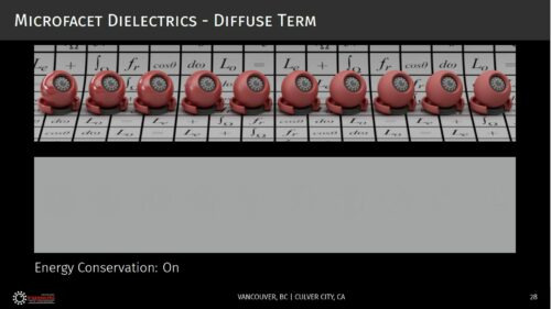 이러한 테스트는 일반적으로 BRDF가 에너지를 보존하는지, 즉 에너지를 잃거나 더하지 않는지 확인하기 위한 것입니다. 예를 들어,거칠기가 증가하고 상호 반사가 너무 커져서 무시할 수 없을 정도로어두워지지 않도록하는 것이 일반적인 주제입니다. 하지만 누락된 에너지만이 문제가 되는 것은 아니며, 흰색 환경이 아닌 회색 환경은 과도한 반사 에너지가 더 밝게 보이기 때문에 편리합니다.
