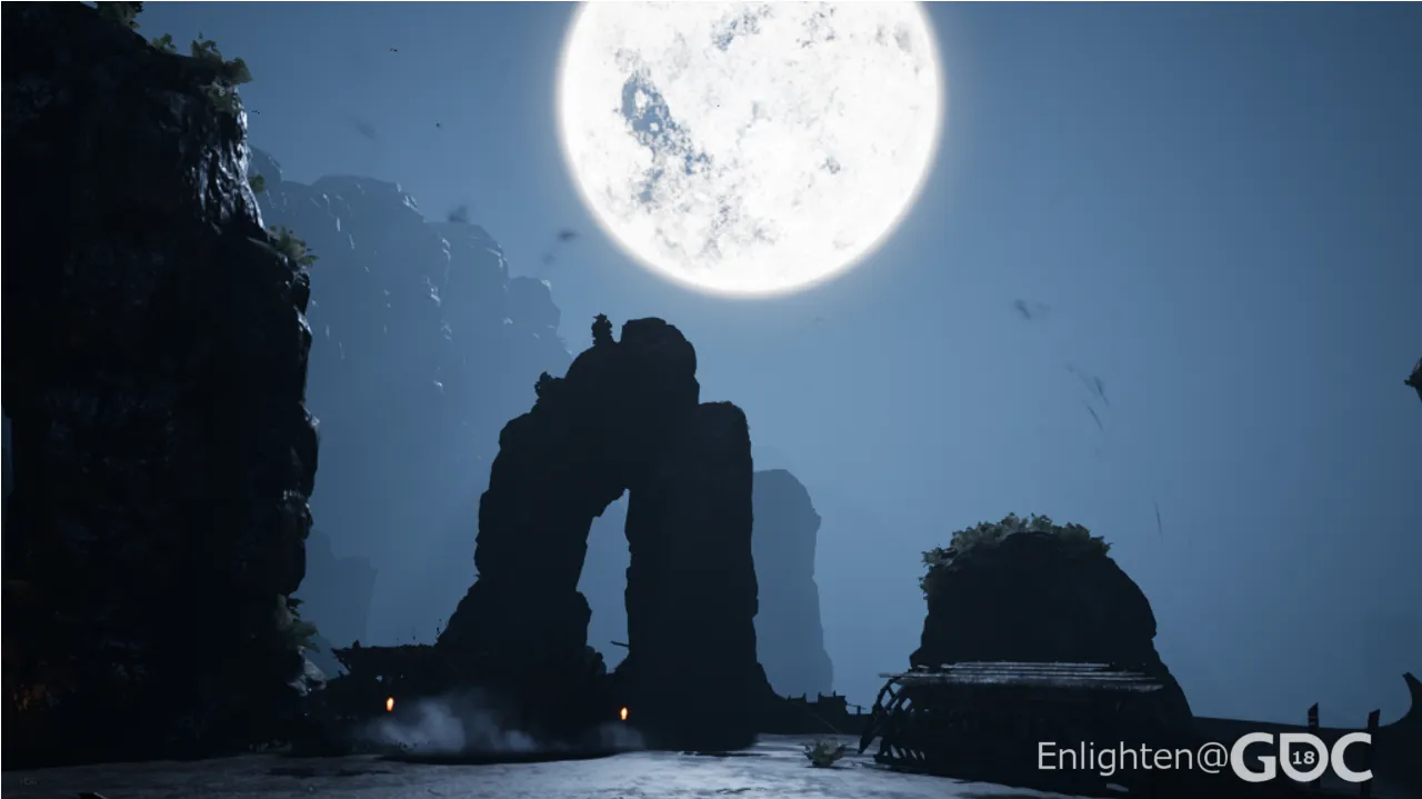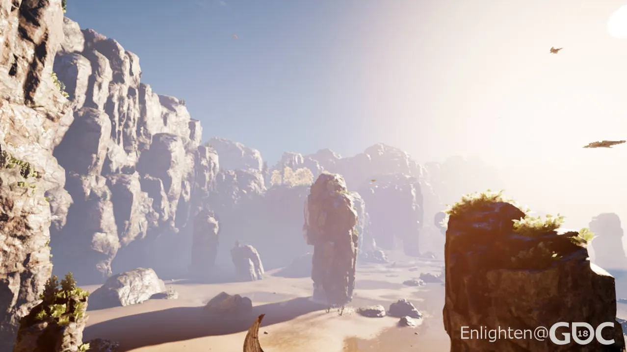 GDC 2018에서 우리는 실제 조명 장치를 활용하는 오픈 월드 레벨을 시연했습니다. 장면은 한낮의 밝은 태양부터 용암이 가득한 협곡까지 다양합니다. 모든 간접 조명은 Enlighten으로 만들어졌습니다.