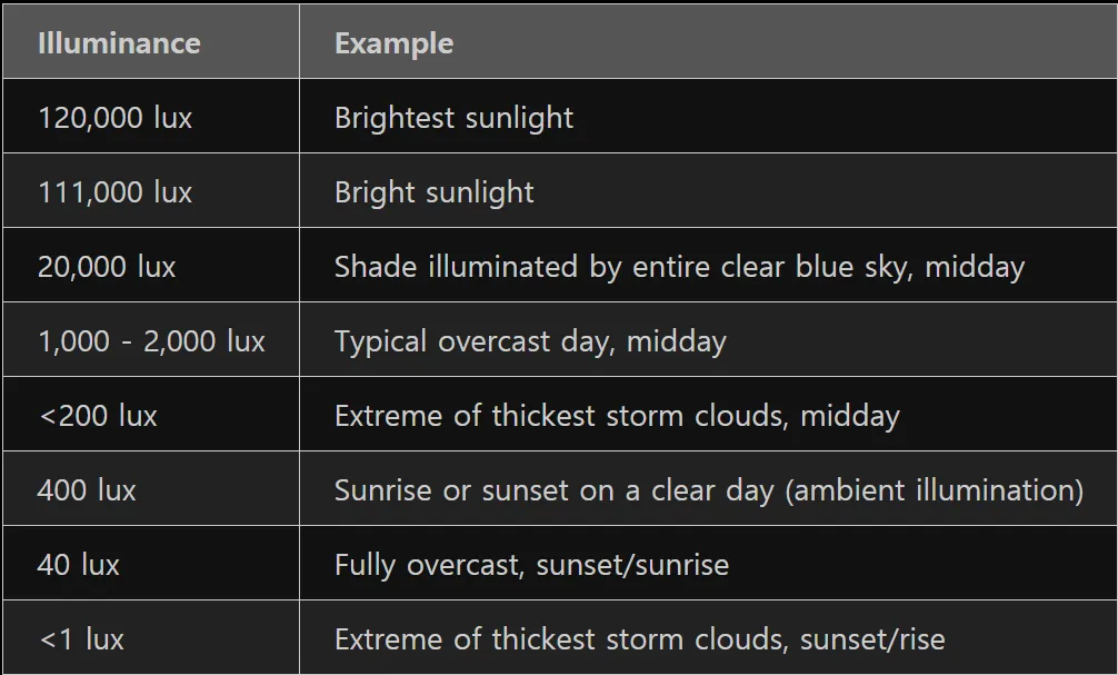 예를 들어 밝은 햇빛이 있는 장면을 만들고 싶다고 가정 해 보겠습니다. 실제 세계에서 햇빛은 약 120,000 lux 를 제공합니다. 게임에서 태양의 밝기를 120,000 lux 로 설정하면 태양이 현실과 일치합니다.