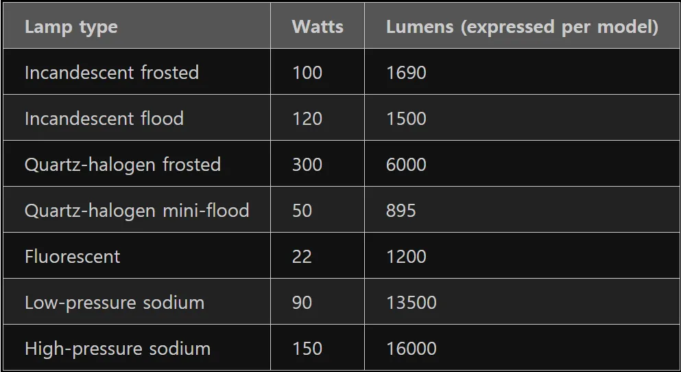 lm=cd⋅sr , 여기서 lm은 루멘, cd는 칸델라, sr은 스테라디안(steradians)입니다.