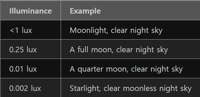 달은 밤 장면의 주요 광원입니다. 실생활에서 달은 맑은 밤에 약 0.25 럭스를 생성하며, 태양에 의해 생성되는 20,000-120,000 럭스와 비교하면 꽤 어둡습니다.