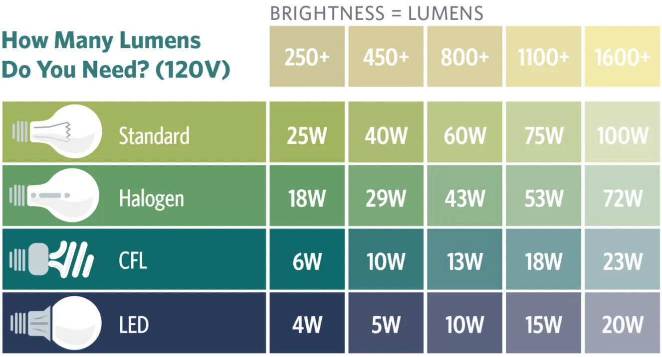 실제 조명에 대한 칸델라 및 루멘 등급은 자유롭게 사용할 수 있습니다. 예를 들어 아래 이미지는 Jackson LED 쇼핑 가이드(https://news.jacksonemc.com/led-light-bulb-shopping-guide)에서 가져온 것입니다. 이 게시물의 끝에는 더 많은 소스가 있습니다.