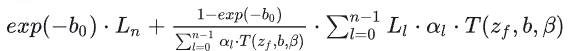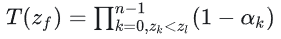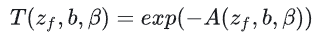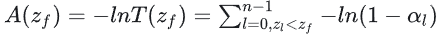 첫 번째 방정식으로 돌아가서, 어떤 깊이에서의 빛 감쇠 값을 나타내는 투과율 T를 추출합니다: