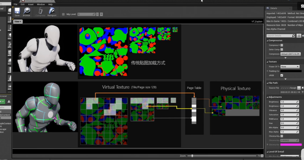 텍스처는 모델 맵 등과 같이 오프라인에서 잘라내야 하는 기존 에셋입니다. 런타임은 큰 텍스처 전체를 로드하지 않고 필요에 따라 페이지를 로드하므로 메모리를 절약할 수 있습니다.