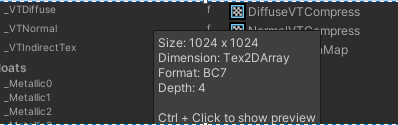 렌더링 효율을 향상시키기 위해 물리 텍스처를 해당 플랫폼의 포맷으로 압축할 수 있으므로 물리 텍스처를 TextureArray로 설정하면 압축 효율도 높아지고 업데이트된 단일 레이어에 대응하기만 하면 압축을 수행할 수 있습니다.