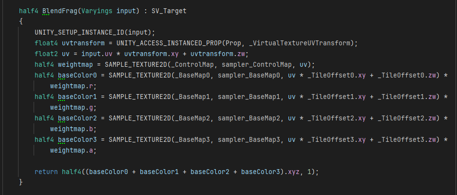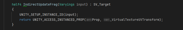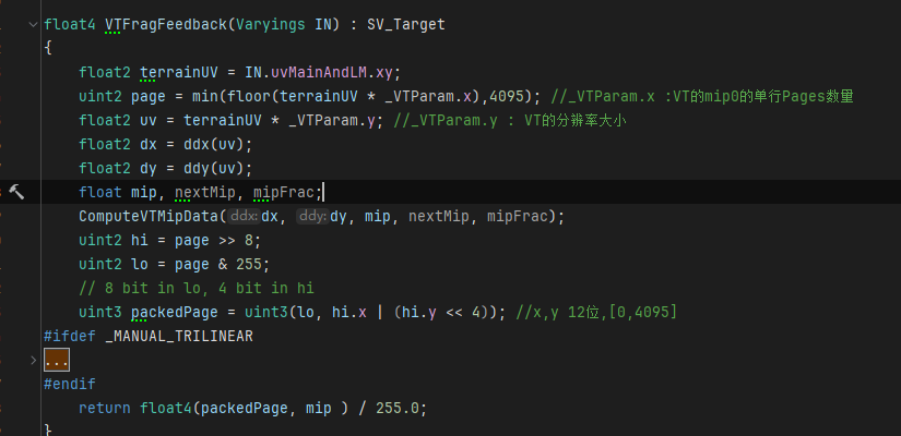 float4 physicalData = SAMPLE_TEXTURE2D_ARRAY_LOD(_VTIndirectTexArray, sampler_VTIndirectTexArray, indirectUV,layer,0) * 255.5;