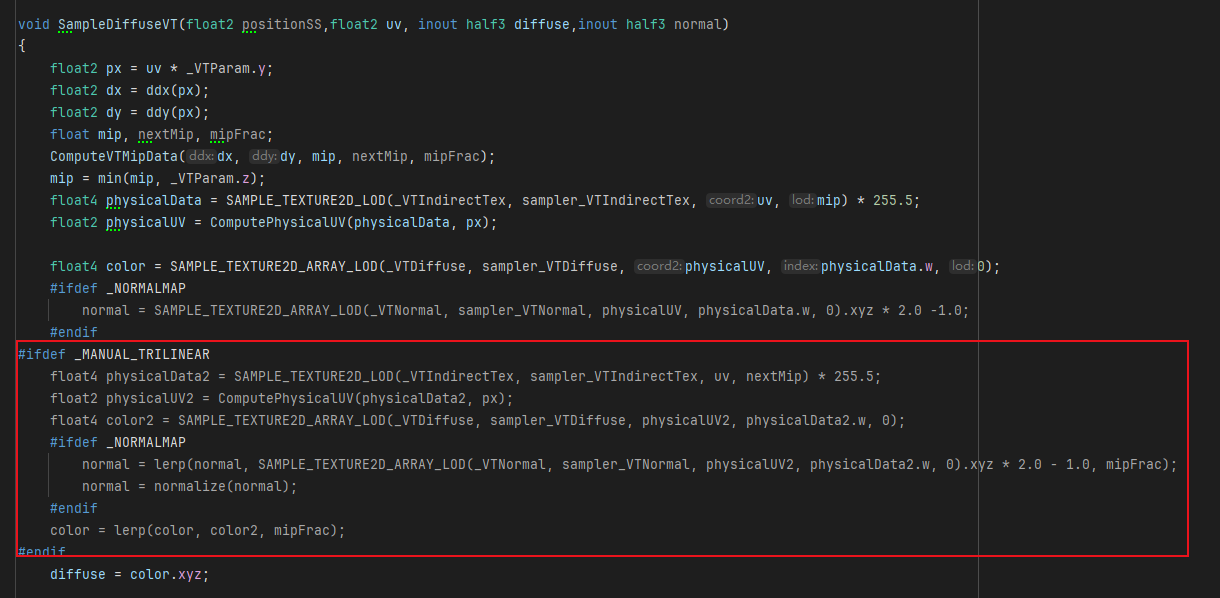 void SampleClipmapVT(float2 positionSS,float2 uv, inout half3 diffuse,inout half3 normal)