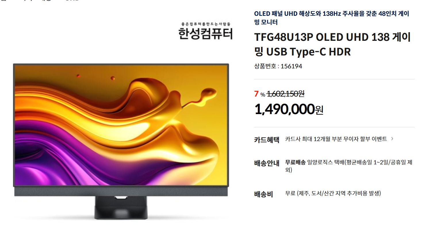 원래는 에보니아 42인치 OLED 를 사려고 했으나 국내에 물건이 단 한대도 없는 상황이라 몇 군데에 오퍼를 넣었지만 모두 자동 구매 취소가 되었고 이래저래 42인치 OLED 모니터를 찾던 차에 한성 48인치 OLED 제품이 가격도 착하고 해서 애라 모르겠다 하고 구매 하게 된 것이다.