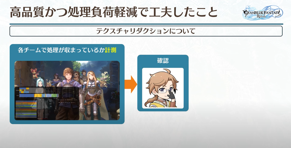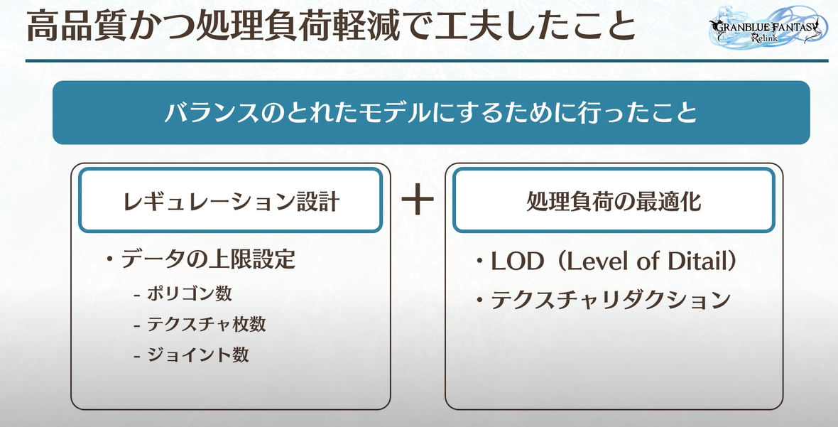 크게 두 가지 작업을 했는데, 하나는 사양을 만들고 각 캐릭터에 대한 한도를 설정하는 것이었습니다. 버텍스 수, 텍스처 수, 뼈대 수 등입니다. 다른 하나는 최적화였는데, 이는 오래된 방식이지만 품질을 유지하면서 최적화할 수 있는 좋은 방법입니다.