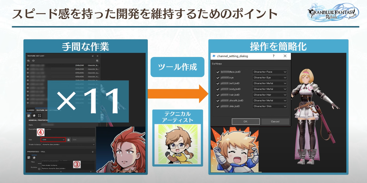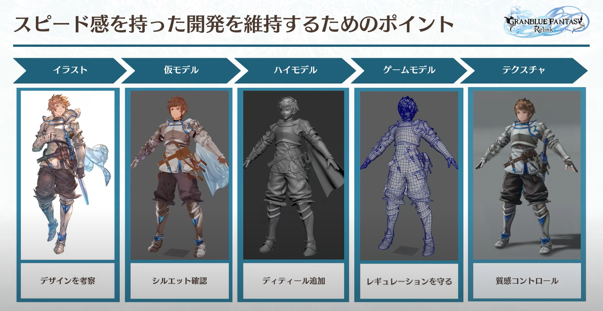 마지막으로 빠른 결과물의 유지 관리가 있습니다. 그랑블루의 캐릭터 개발 프로세스는 다음과 같습니다: