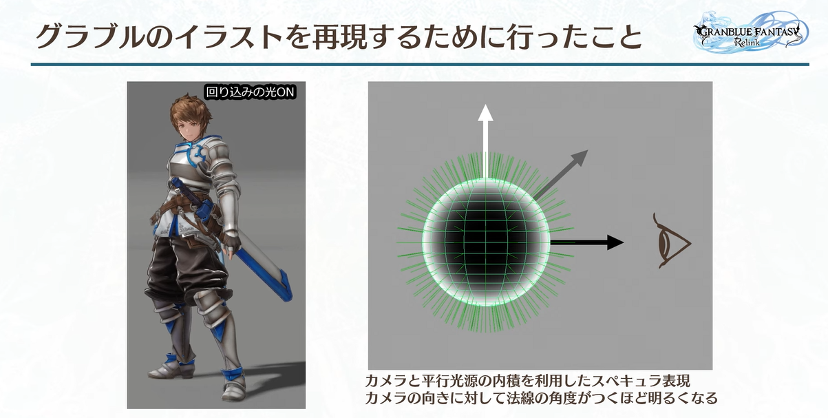 계산은 노멀과 시선의 도트 곱인 간단한 림라이트 방식을 사용합니다. 여기에 시선과 광원의 방향에 도트 곱을 곱하여 광원이 비추는 림 부분만 밝게 하여 얼굴 림 조명과 같은 방향이 되도록 할 수 있습니다.