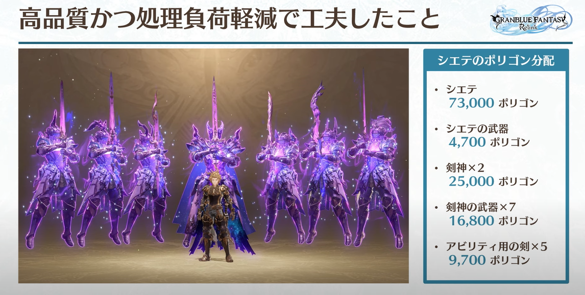 검에 스킬을 넣을 때 7개의 스킬이 동시에 나타나며, 데이터 양을 줄이기 위해 동일한 바디 모델을 사용합니다. 실루엣과 눈에 잘 띄는 부분의 패싯 수를 늘리기 위해 보이지 않는 부분에 할당된 패싯 수를 최소화했습니다.
