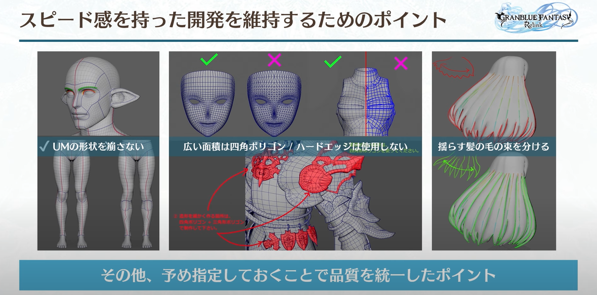그랑블루의 세계관을 복원하기 위해서는 많은 수의 캐릭터를 만들어야 합니다. 정해진 기한 내에 캐릭터를 제작하기 위해서는 일정한 제작 속도를 유지해야 합니다. 위의 세 가지 사항은 모델을 제작하는 과정에서 고려해야 할 사항입니다. 각 포인트에 대한 구체적인 내용은 아래에서 다뤄보겠습니다.