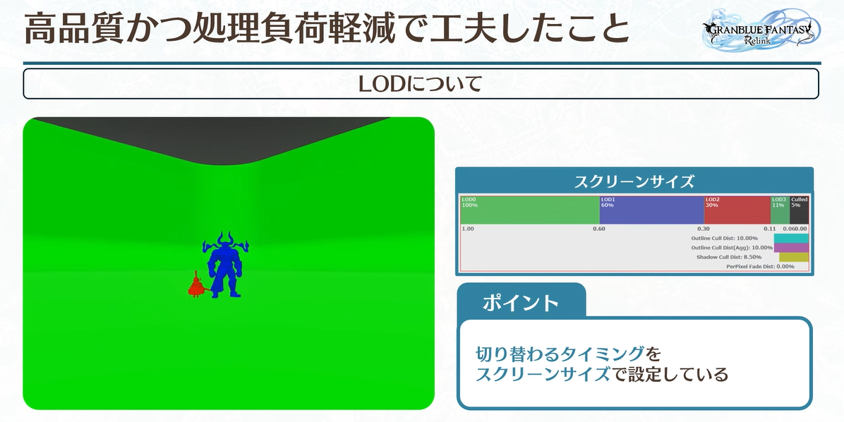 캐릭터와 카메라 사이의 거리만으로 전환을 수행하면 캐릭터와 캐릭터 사이의 크기 차이로 인해 품질 차이가 크게 발생합니다. 따라서 LOD의 전환 규칙은 캐릭터의 화면 비율입니다. 작은 캐릭터는 먼저 LOD를 전환하고 큰 캐릭터는 나중에 LOD를 전환합니다.