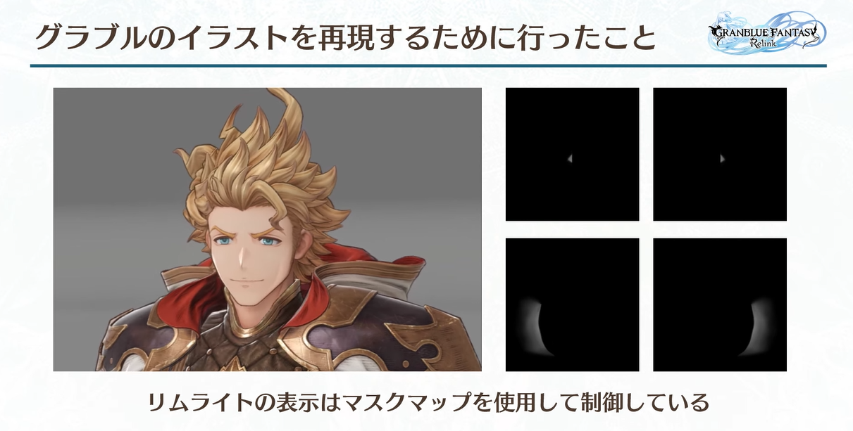 따라서 마스크 매핑을 사용하여 실루엣의 양쪽과 코의 양쪽에 하이라이트를 4채널의 RGBA로 배치하고 카메라 위치 표시에 따라 채널을 전환하여 제어합니다.