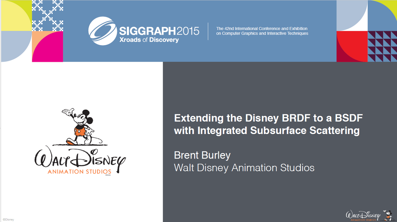 2013 년에 출시 된 애니메이션 영화 "Frozen"에서 Disney는 이전에 개발 된 Disney Principled BRDF 물리 기반 쉐이딩 시스템을 계속 사용하지만 굴절 및 서브 서피스 스 캐터링과 같은 효과를 위해서는 BRDF와 별도로 간접적으로 계산해야합니다. 조명은 점 구름을 사용하여 근사됩니다. 2014 년 "Big Hero 6"이후 Disney는 경로 추적 전역 조명을 사용하여 새로운 영화를 만들기 시작했습니다. 따라서 원래 BRDF 모델은 더 이상 수요를 충족 할 수 없으므로 Disney는 이전 Disney Principled BRDF, 새로 개발 된 Disney BSDF 및 SIGGPRAPH 2015를 기반으로하여 "Disney BRDF를 "통합 지하 표면 산란"이 공식적으로 제안되었다.