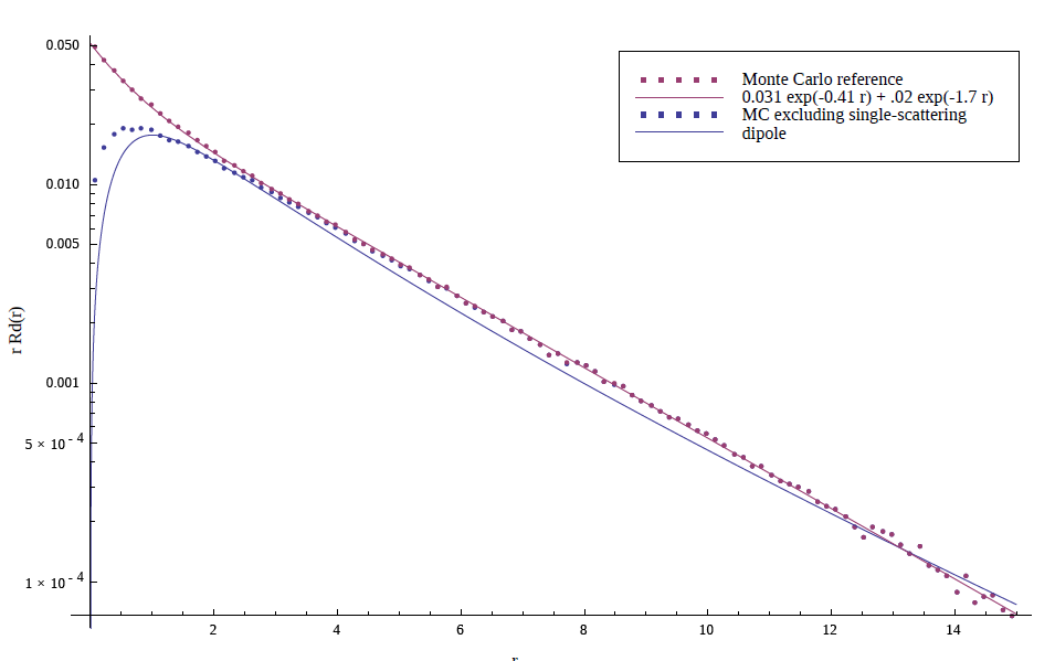 - 2 개의 지수 항의 합에 기초한 표면 하 확산 시뮬레이션 모델이 제안된다. 지하 확산. Disney는 Monte Carlo 시뮬레이션을 통해 단일 산란의 확산 프로파일을 포함한 일반적인 산란 매개 변수에 대해 두 지수의 합을 사용하는 것이 좋습니다 시뮬레이션이 수행되었고, 쌍극자 확산보다 더 나은 렌더링 결과가 얻어졌다. 아래 그림과 같이.