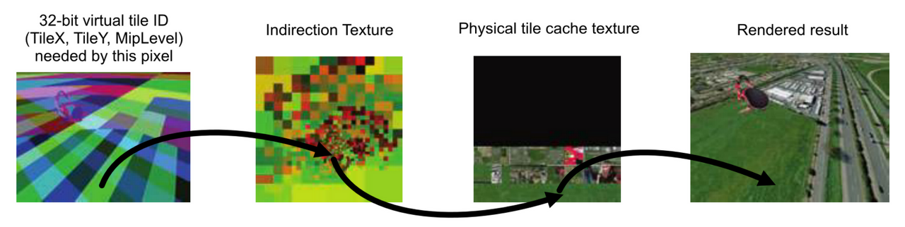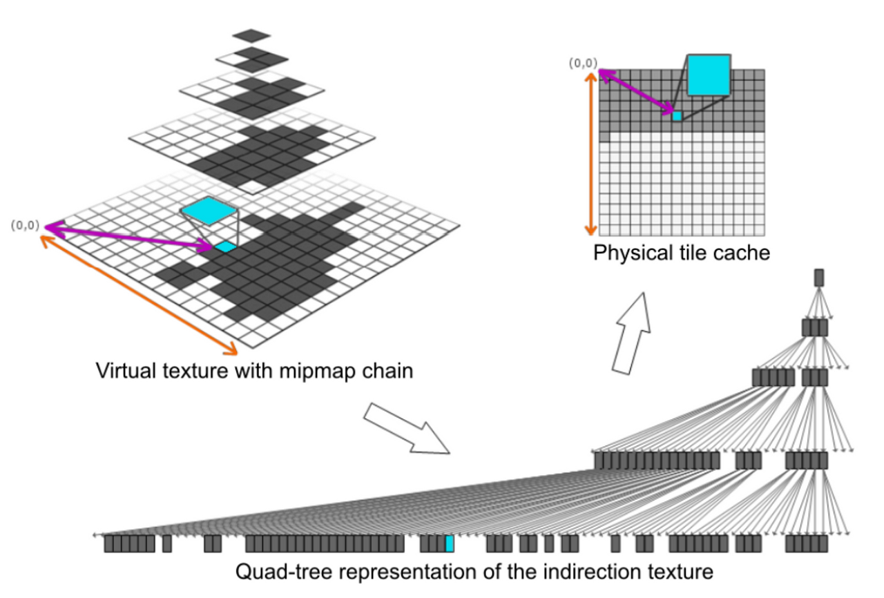 간접 텍스처는 가상 텍스처 좌표를 물리적 좌표로 변환하는 페이지 테이블과 비교할 수 있는 구조입니다. 이는 물리적 비디오 메모리의 타일이 타일 캐시에 저장되기 때문에 필요합니다. 이 타일 캐시는 주소 지정 프레임으로 분할된 큰 텍스처입니다.