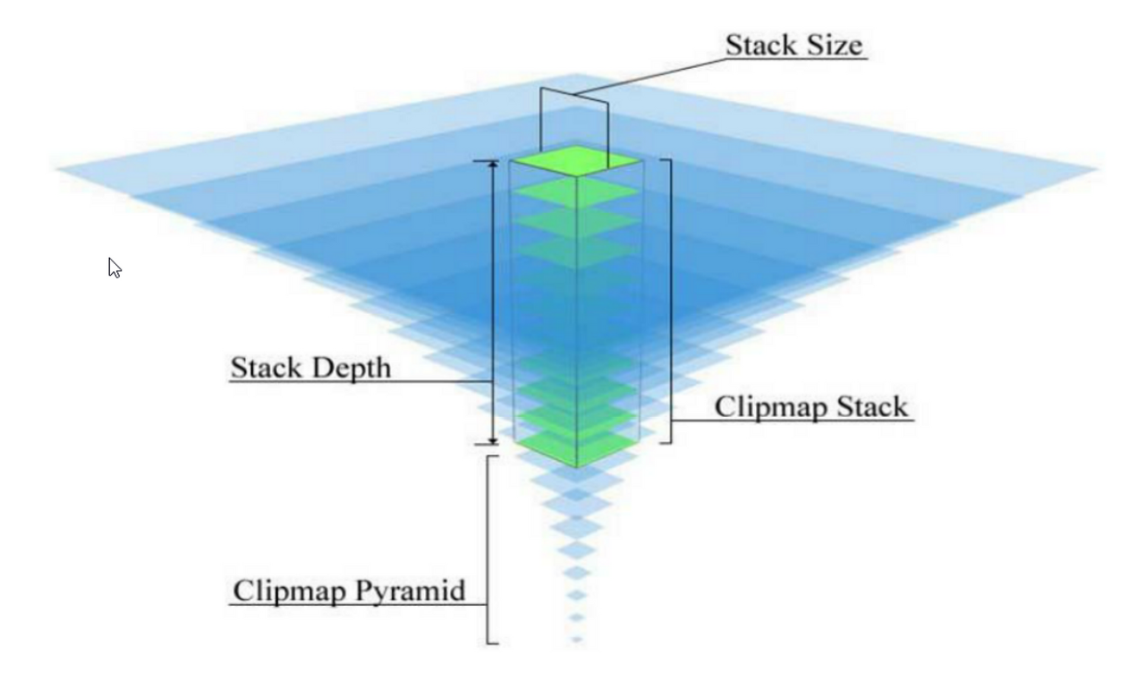 mip-map 레벨의 크기가 스택 크기보다 큰 경우, 클립 중심 주변의 스택 크기 영역이 mip-map 레벨에서 잘려서 클립 맵 스택에 저장됩니다. mip-map 레벨이 스택 크기보다 작은 경우, 전체 텍스처를 낮은 해상도로 커버하며 클립 맵 피라미드에 저장됩니다. 이렇게 하면 클립 중심 주변 영역의 원하는 세부 레벨이 아직 비디오 카드에서 사용할 수 없는 경우 모든 텍스처 영역의 대체 룩업 텍스처(Look-up texture)로 사용할 수 있습니다.