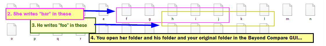 이렇게 하면 세 가지 버전이 생성됩니다: 원본 폴더(조상)와 두 개의 새로운 폴더입니다. 이들을 통합해야 합니다. Beyond Compare에서는 이 과정을 폴더 병합 세션이라고 합니다. 이 예제에서 사용된 파일을 다운로드하려면 다음 링크에서 마우스 오른쪽 버튼을 클릭하고 "다른 이름으로 저장"을 선택하세요: