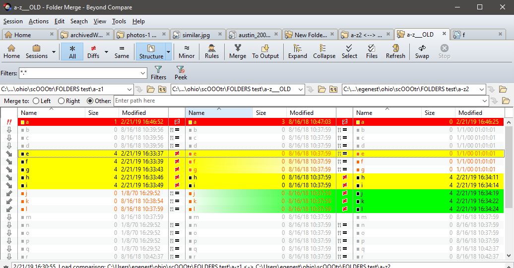 위의 다운로드 가능한 샘플 데이터로 실험해보시기를 권장합니다. 샘플 폴더를 살펴본 후, Scooter Software 사이트를 방문해보세요. 공식 Beyond Compare 문서의 30페이지에서 FolderMerge에 대한 자세한 설명을 확인하실 수 있습니다.