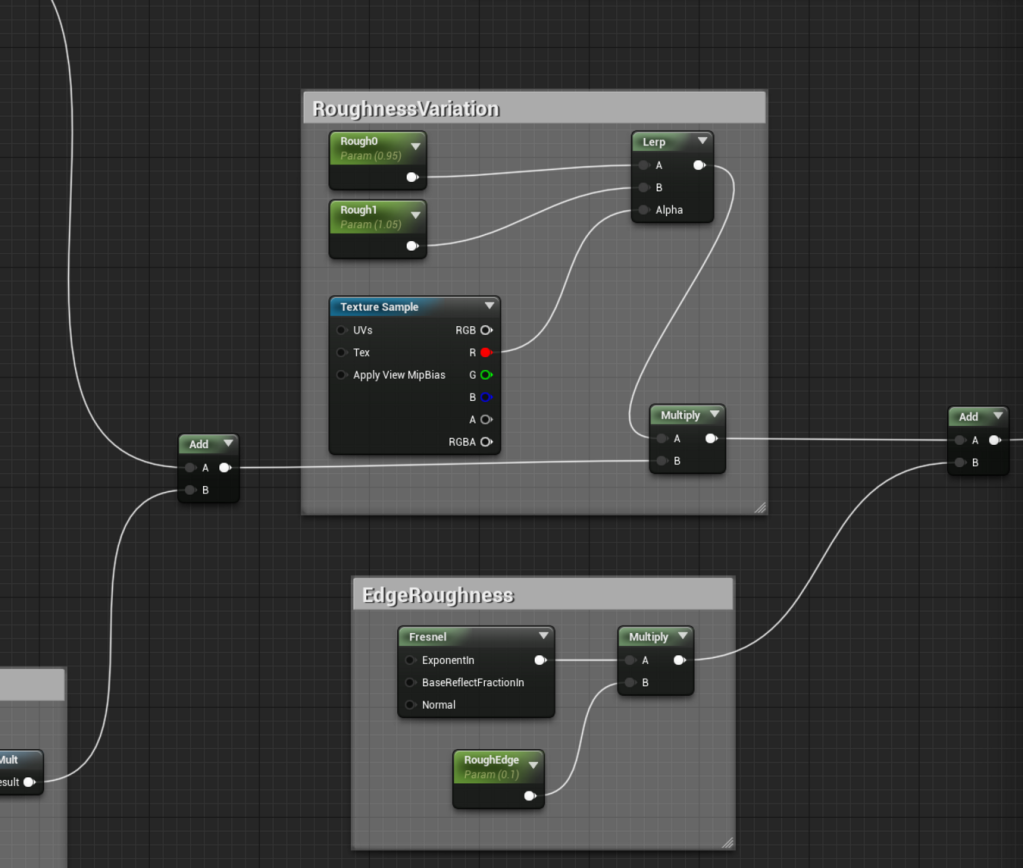 전체 표면의 평균 거칠기 값은 0.95이며, 두 번째 거칠기 값은 1.05로, 텍스처 샘플러를 사용하여 보간합니다. 이 값은 더욱 정밀한 미세 거칠기와 곱해진 후, 외부 표면의 프레넬 결과와 더해집니다.