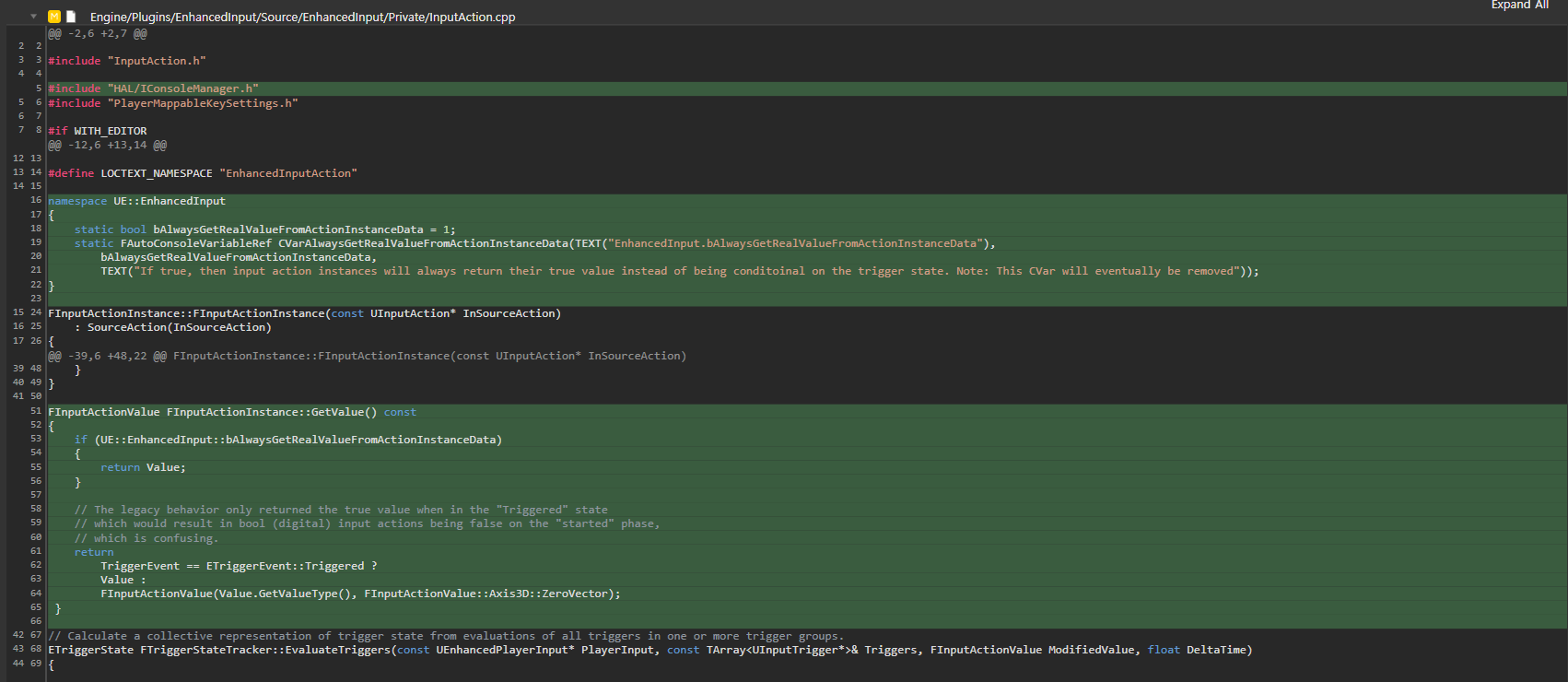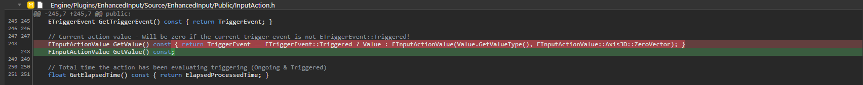 EnhancedInput.bAlwaysGetRealValueFromActionInstanceData 라는 CVar 값이 기본으로 1로 설정 되어 있음으로 해당 커밋을 체리픽으로 땡겨와서 추가를 해 주면 기존의 인풋 BP 구조에 영향을 주지 않습니다.