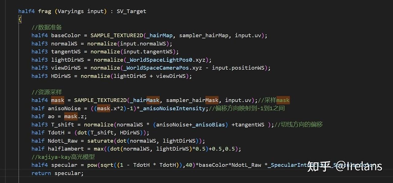 여기서는 이방성 하이라이트를 구현하기 위해 고전적인 Kajiya-Kay 모델을 사용했습니다.