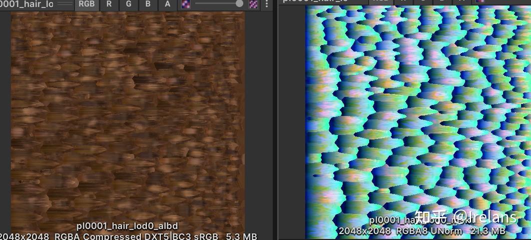우선, 언팩된 리소스를 살펴보면 헤어와 관련된 주요 요소는 디퓨즈와 마스크 맵입니다. 알파 채널은 모두 순수 흰색이므로 RGB만 사용된다고 볼 수 있습니다.