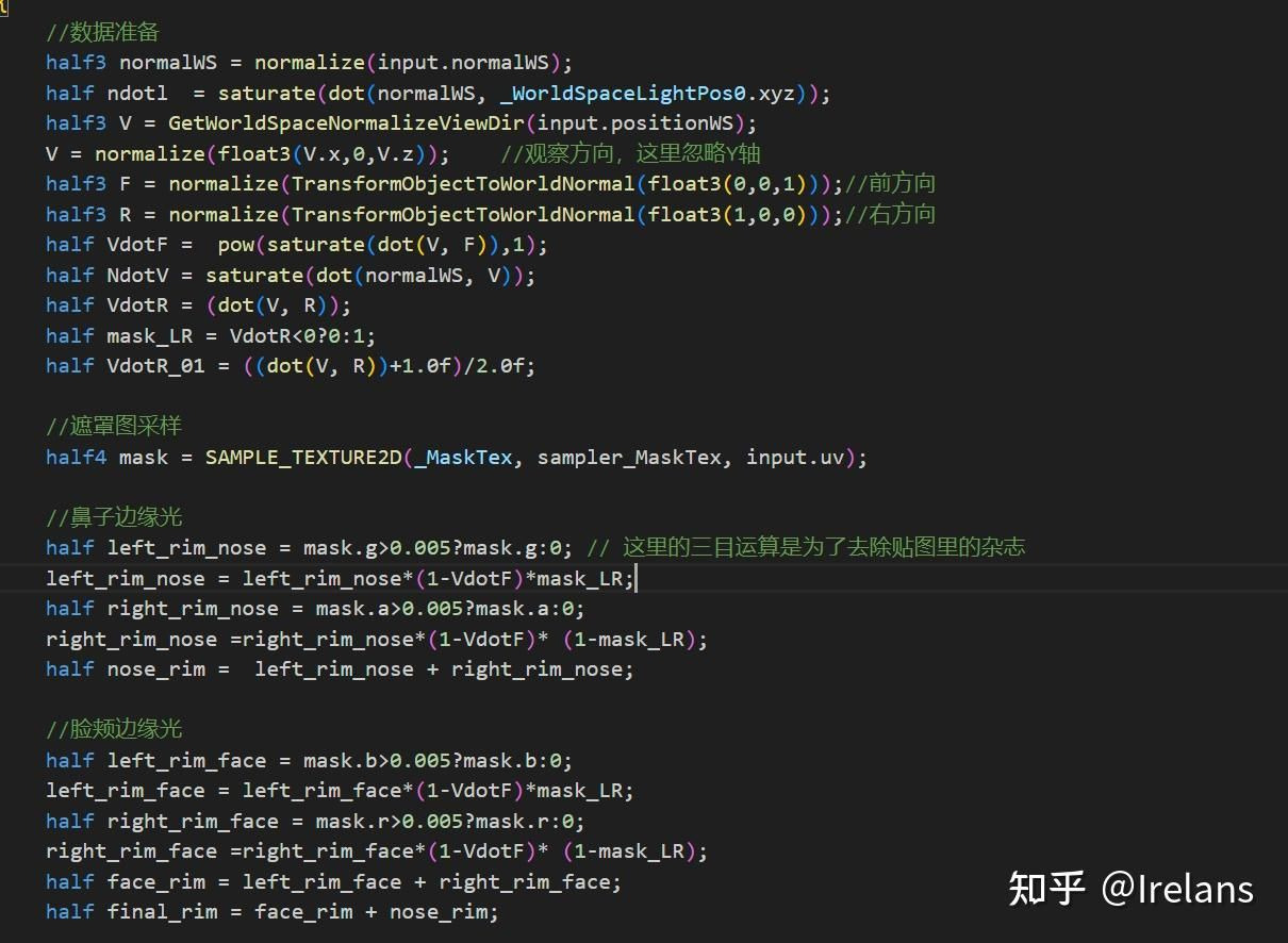 얼굴 렌더링은 전통적인 SDF 맵 그림자나 법선 벤딩 방식으로 명암을 구분하지 않고, 대신 림라이트 부분을 사용하여 전체적인 시각적 밝은 부분을 대체했습니다. 이렇게 함으로써 스타일라이즈드한 효과를 더욱 강화하고, 전통적인 셀 셰이딩이 만들어내는 "음양 얼굴" 현상을 방지할 수 있습니다.
