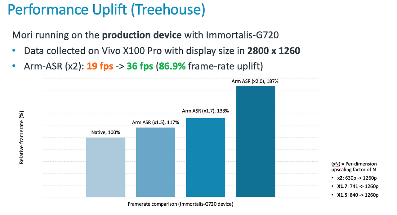 1.5배에서 17%, 1.7배에서 33%, 그리고 2배 업스케일링을 사용할 때는 놀라운 87%의 성능 향상을 얻었습니다. Arm ASR을 활성화했을 때, 이 장면에서 프레임률이 19 FPS에서 36 FPS로 증가했습니다.