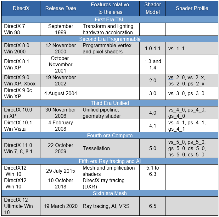DirectX 세대별 요약은 표 1에 나와 있습니다.