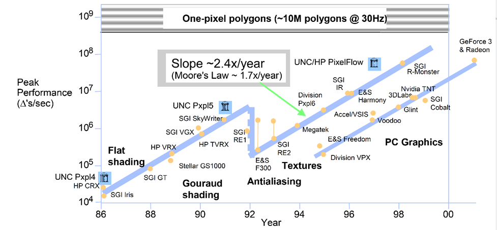 초당 삼각형 수를 성능 지표로 사용했을 때, 그래픽스 하드웨어는 지속적으로 무어의 법칙의 예측을 뛰어넘었습니다. 이러한 놀라운 성장은 하드웨어 설계자들이 효과적으로 활용한 그래픽스 연산의 본질적인 병렬 특성에서 비롯되었습니다. 2001년까지 PC 그래픽스 성능이 매우 크게 향상되어 고가의 전문 그래픽스 시스템들은 더 이상 필요하지 않게 되었습니다.