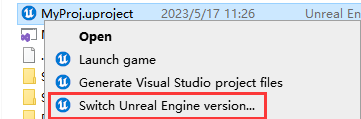 *.uproject 파일의 우클릭 메뉴에서 현재 프로젝트의 엔진 버전을 전환할 수 있습니다: