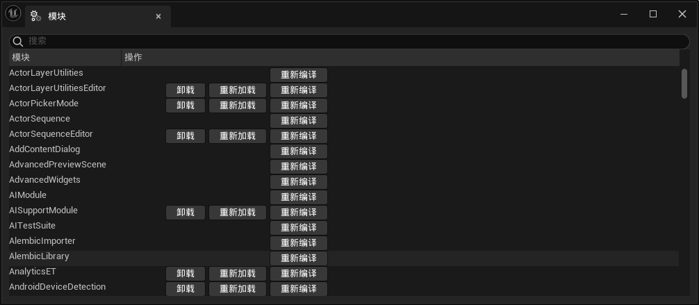 UE 에디터 메인 패널의 도구(Tools) - 디버그(Debug) - 모듈(Modules)에서 현재 프로젝트에서 활성화된 모든 모듈을 확인할 수 있습니다: