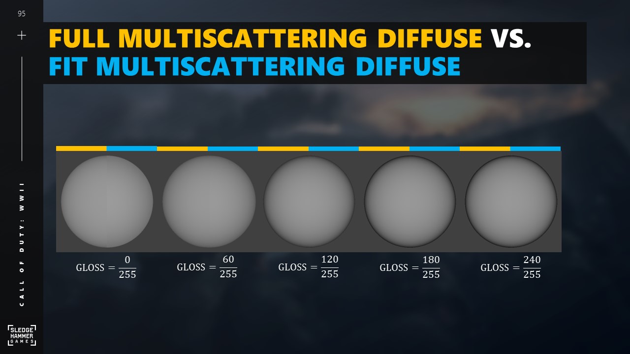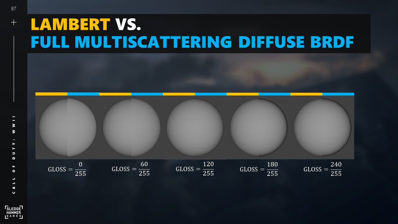 오른쪽 절반은 완전히 시뮬레이션된 멀티스캐터링 디퓨즈 BRDF를 사용하여 라이팅합니다.