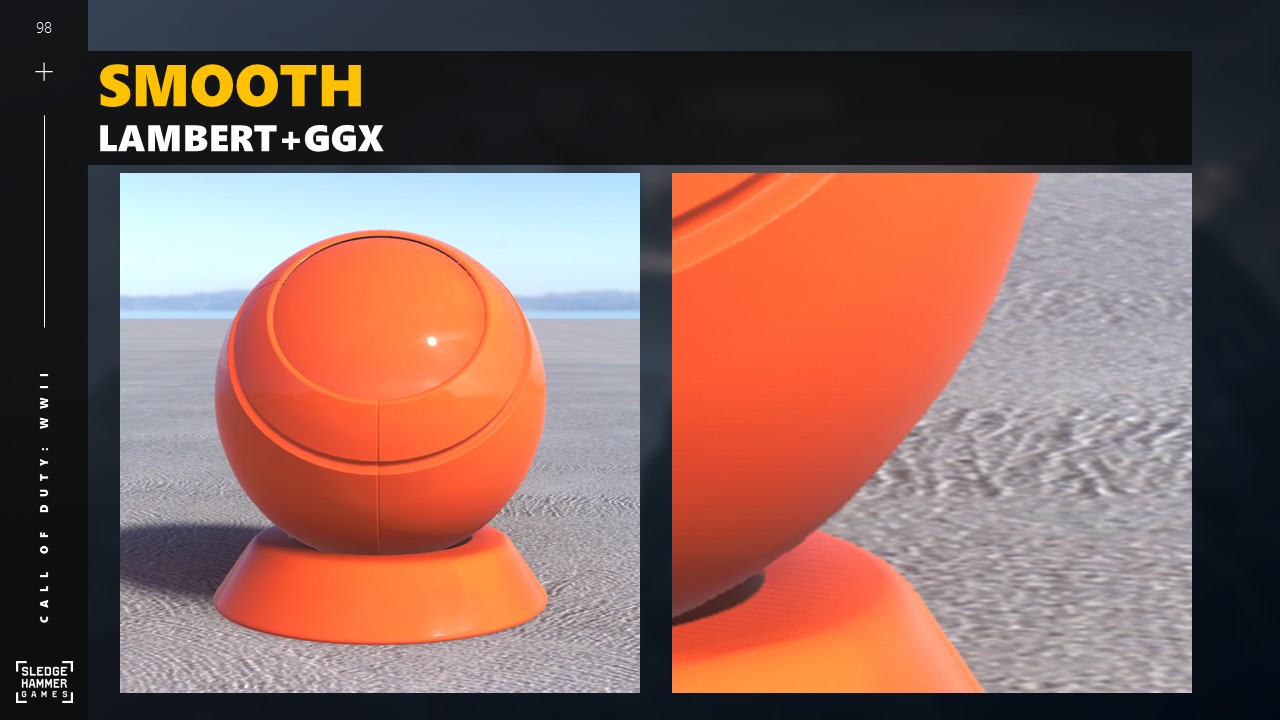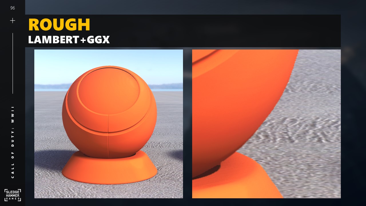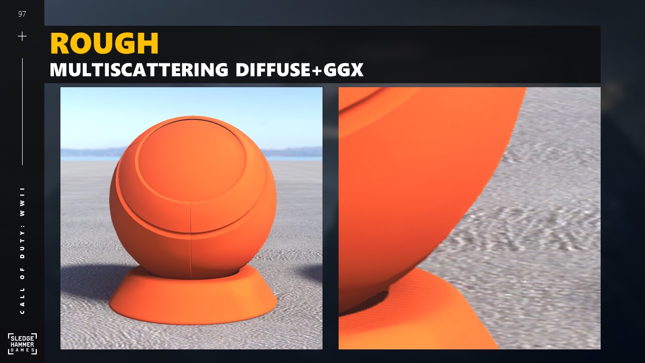 왼쪽은 멀티스캐터링 디퓨즈 모델을 사용한 거친 머티리얼을 나타냅니다.