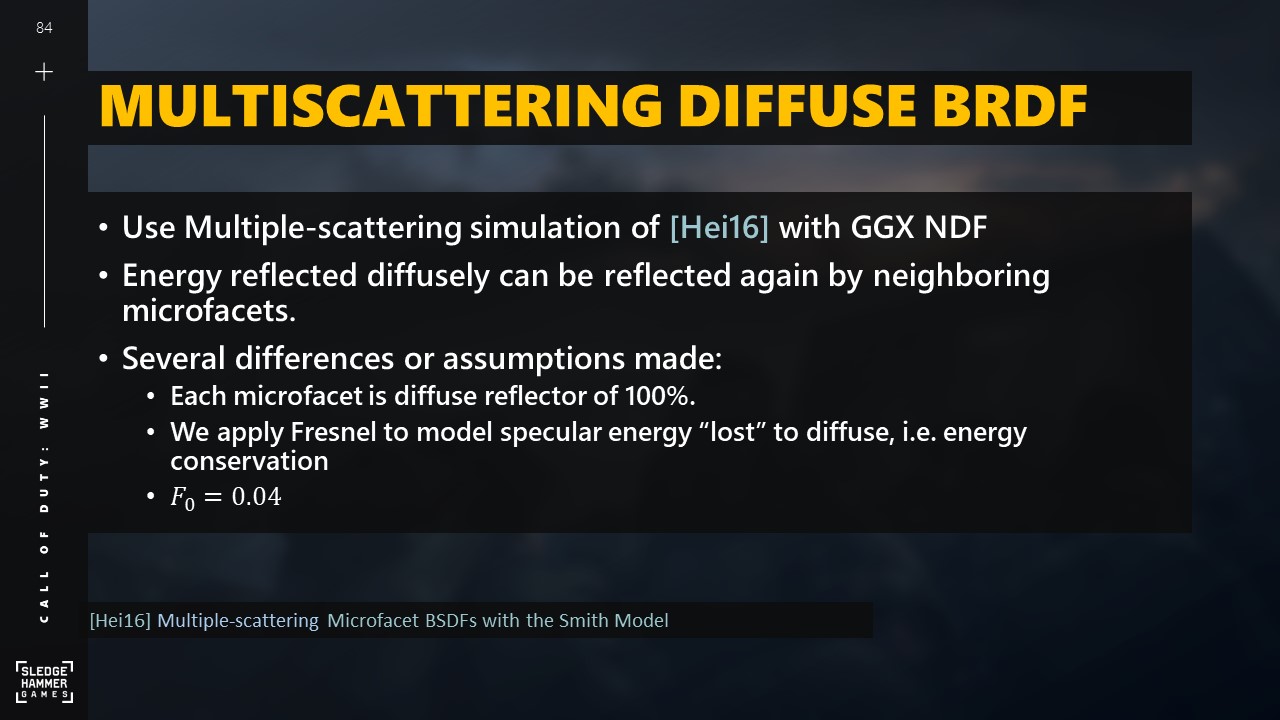 다중 산란 모델을 사용한다는 것은 확산 반사된 에너지가 인접한 마이크로 패싯에 의해 다시 반사될 수 있다는 것을 의미합니다.