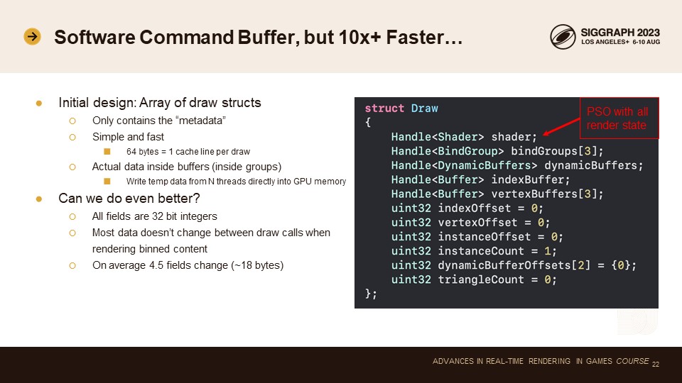 이 소프트웨어 명령 버퍼는 대부분의 사람들이 익히 알고 있는 것과는 완전히 다릅니다. 소프트웨어 명령 버퍼에는 데이터가 없습니다. 이미 업로드된 데이터를 가리키는 메타데이터만 있습니다. 또한 메타데이터는 그룹화되어 있어 개별 바인딩이나 개별 상태보다 훨씬 작습니다. 따라서 드로우 호출을 단 64바이트의 데이터, 즉 하나의 CPU 캐시 라인으로 표현할 수 있습니다.