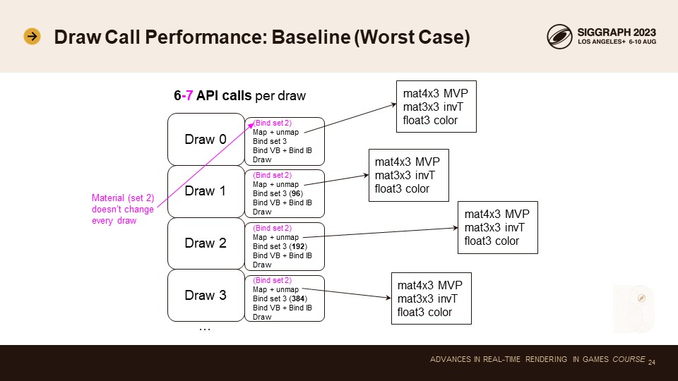 머티리얼 바인딩을 수정하는 것은 일반적이지 않습니다. 이미 로드된 머티리얼의 노멀 맵을 얼마나 자주 교체하나요? 오브젝트를 렌더링하는 데 사용되는 셰이더를 얼마나 자주 변경하나요? 오브젝트를 렌더링하는 데 사용되는 렌더링 상태를 얼마나 자주 변경하나요? 일부 특수 효과를 제외하고는 거의 변경하지 않습니다. 오브젝트 색상과 오브젝트 변형에 애니메이션을 적용하는 것이 더 일반적인 작업입니다. 오브젝트의 작은 하위 집합이 매 프레임마다 애니메이션을 적용합니다. 이런 일이 발생할 때만 비용을 지불하고 싶습니다. 모든 그리기 호출에 대해 비용을 지불하는 것은 아닙니다.