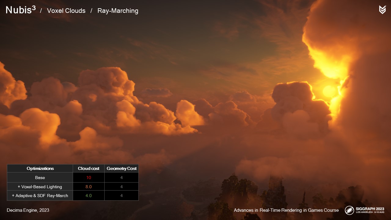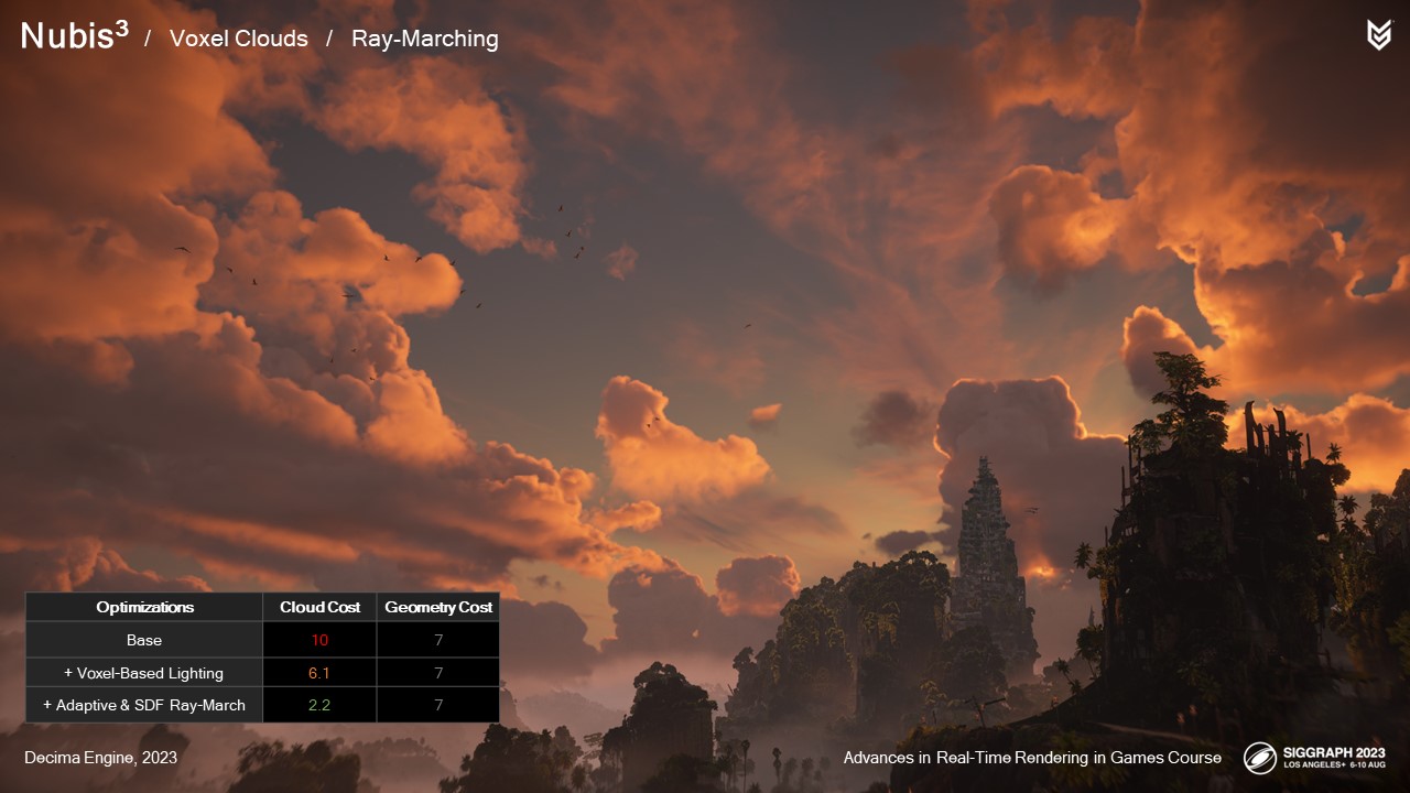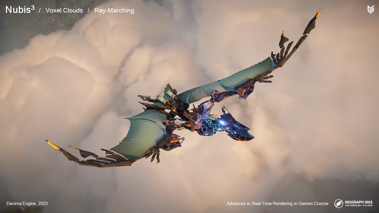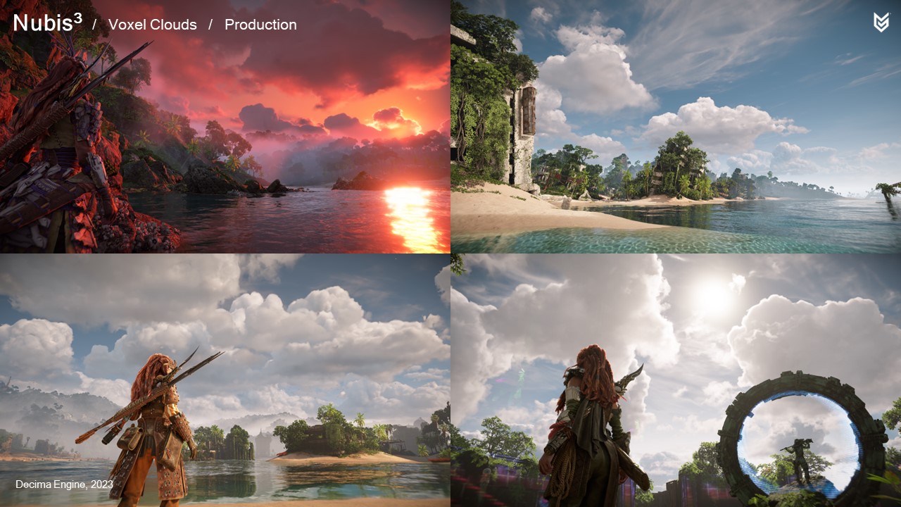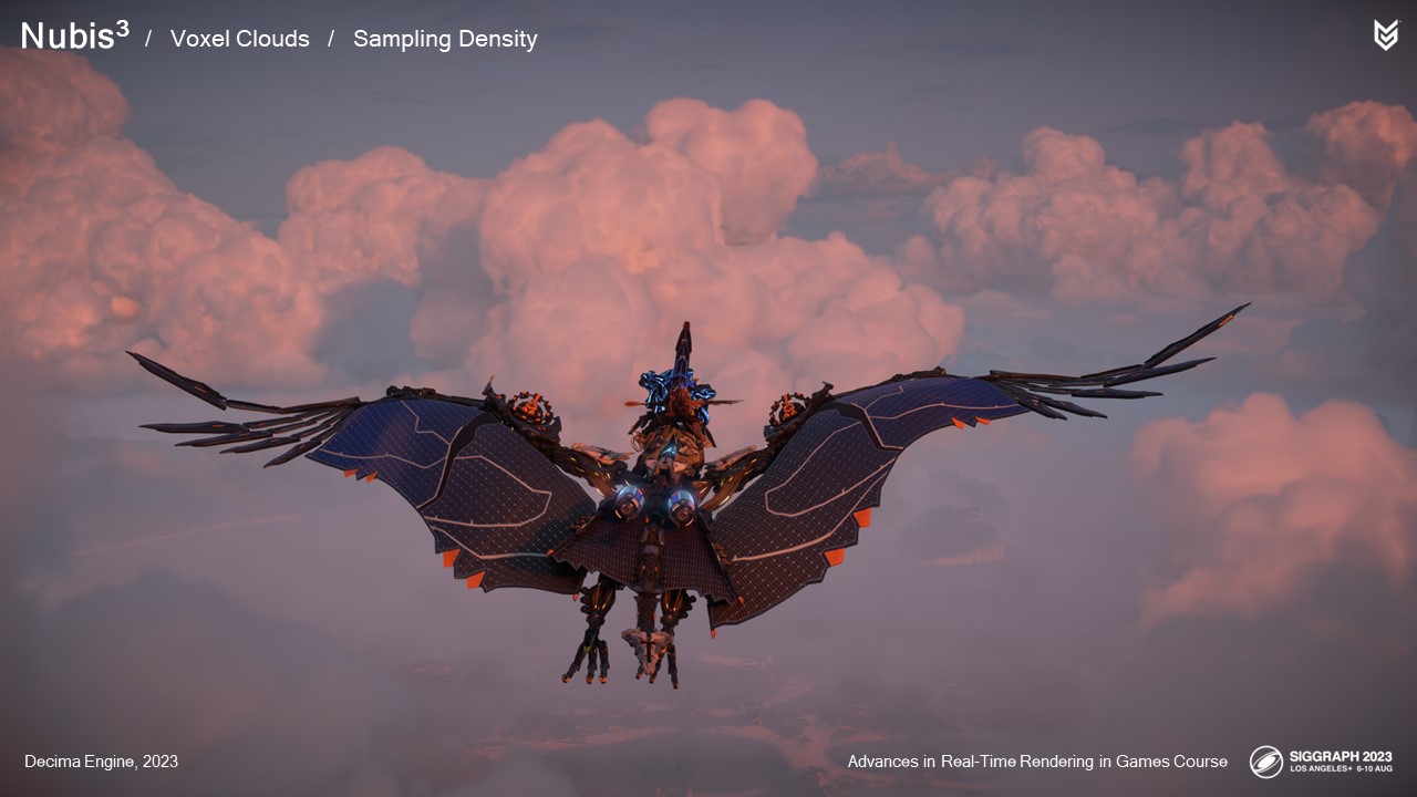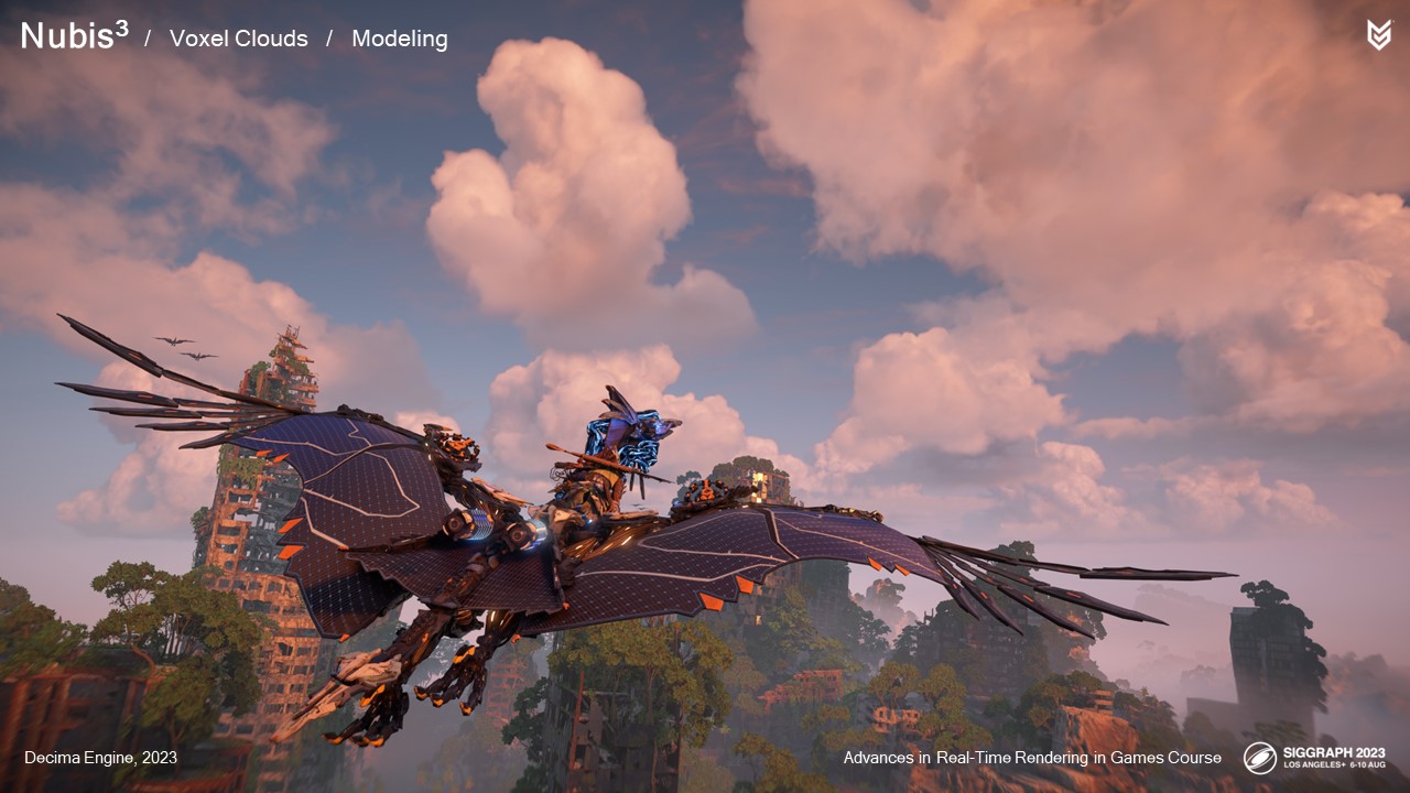 2014년에 여러 가지 구름 모양을 시뮬레이션하고 다양한 렌더링 방법을 시도했지만, 그 어떤 것도 PlayStation 4에 적합하거나 시리즈 첫 번째 게임의 요구 사항을 충족하지 못했습니다: 호라이즌 제로 던의 요구 사항을 충족하지 못했습니다.