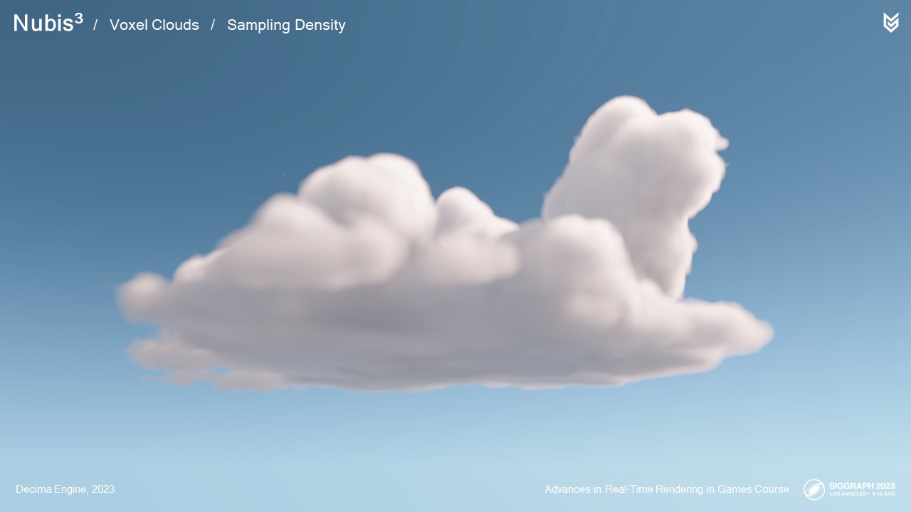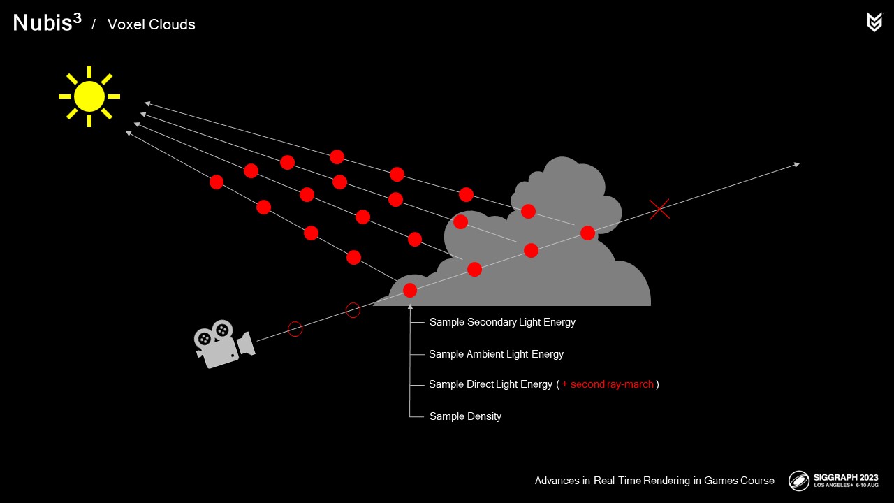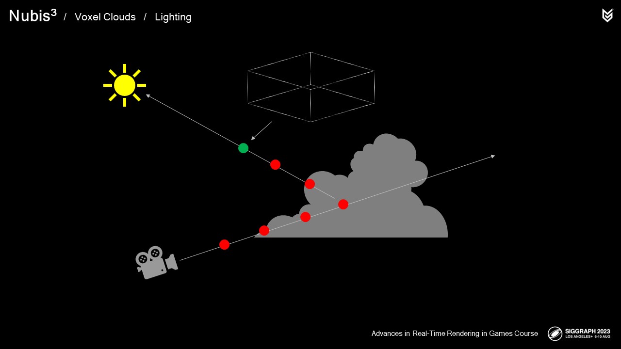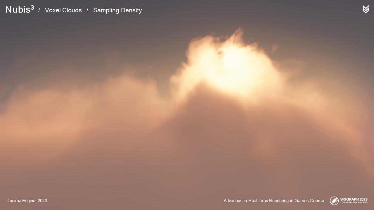 엔벨로프 내부에서 샘플링을 시작하면서 더 작은 광선 행진 단계를 수행하여 실제 구름 밀도를 샘플링하기 시작합니다.