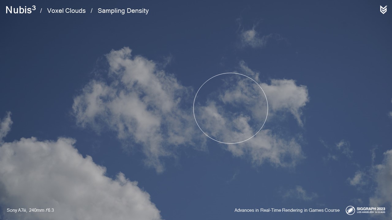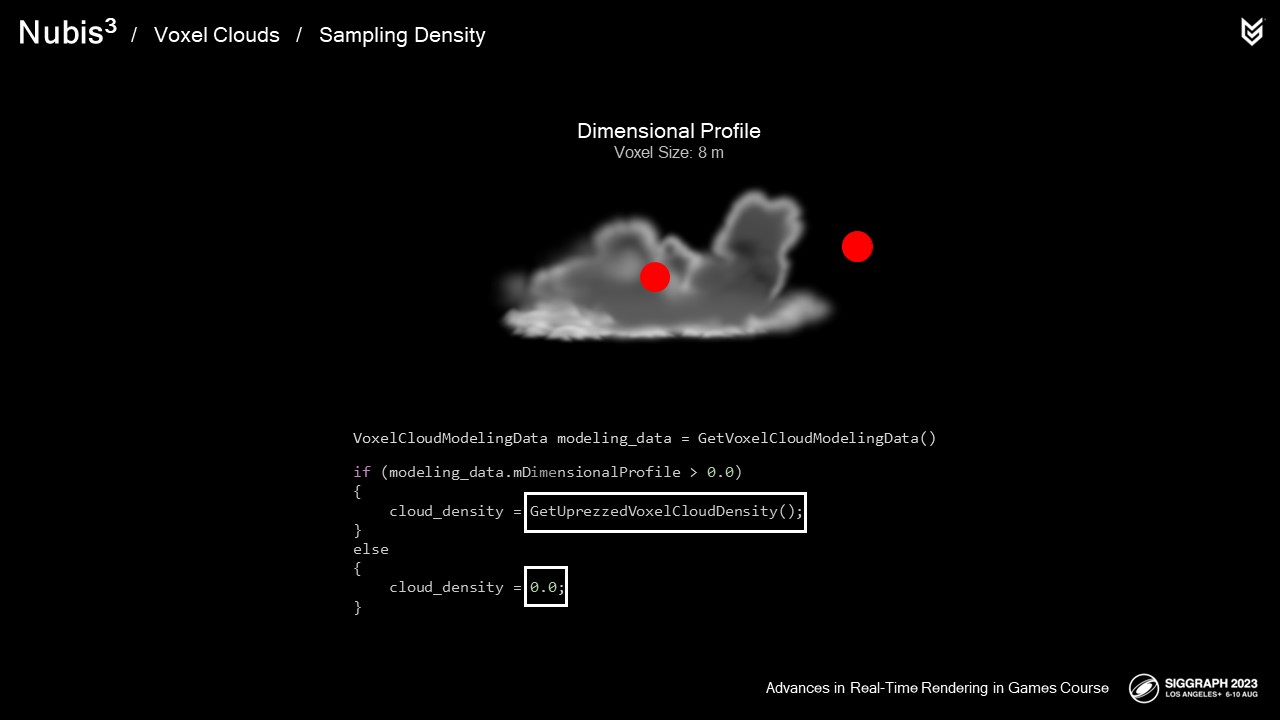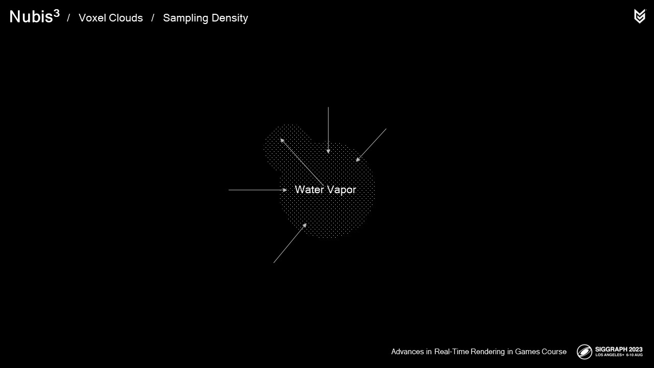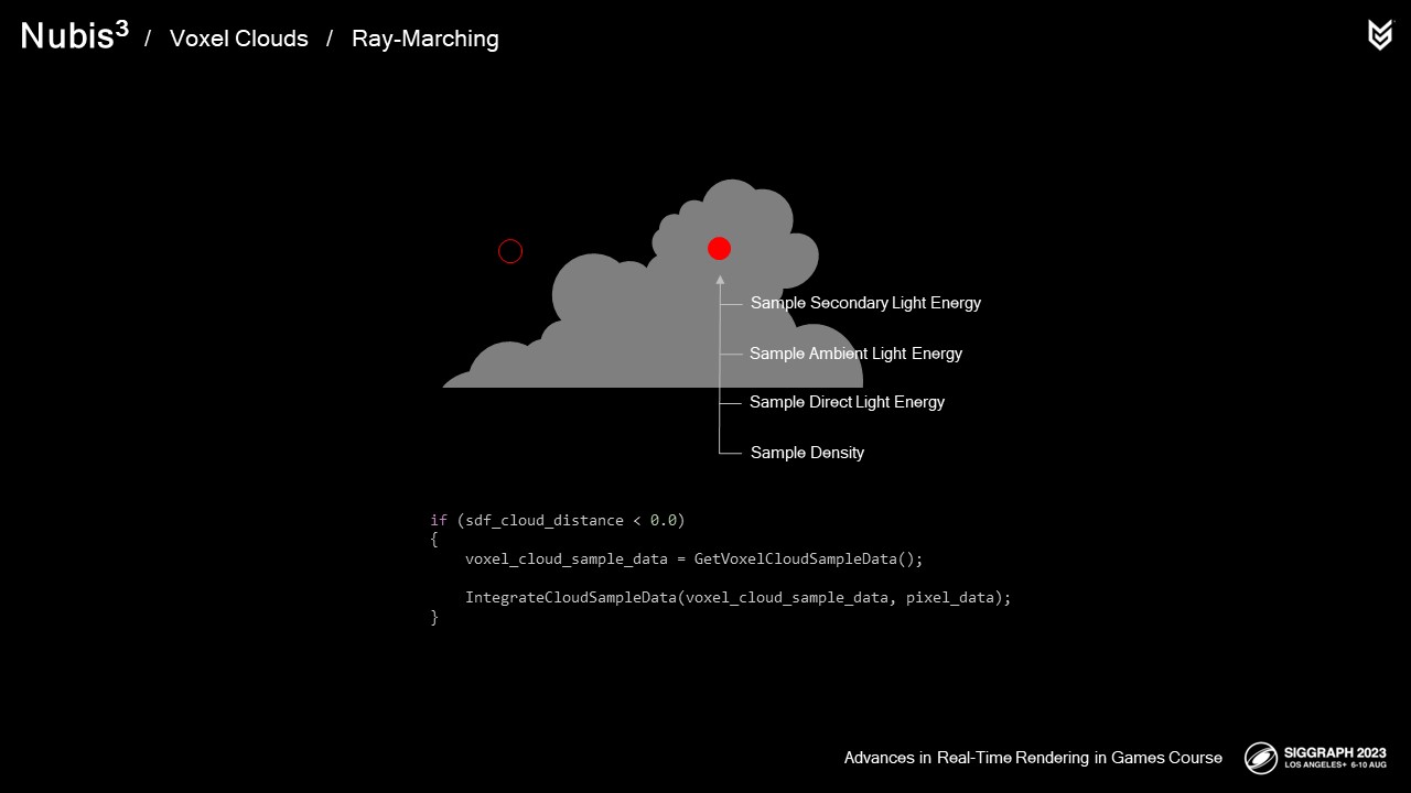 엔벨로프 내부에서 샘플링을 시작하면서 더 작은 광선 행진 단계를 수행하여 실제 구름 밀도를 샘플링하기 시작합니다.