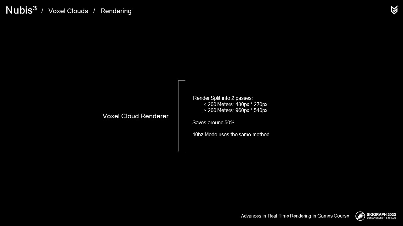 엔벨로프 메서드에서는 템포럴 업스케일링을 없애고 렌더링을 두 패스로 나눈 것을 기억하세요: 원거리는 고해상도로 렌더링하여 에일리어싱을 방지하고, 근거리에서는 저해상도로 렌더링하여 광선 행진에서 가장 비용이 많이 드는 부분의 성능을 개선했습니다. 비슷한 접근 방식이 40 및 60hz 모드에서도 작동할까요? 정답은 '그렇다'입니다. 고프레임레이트 모드에서도 정확히 동일한 방식을 사용합니다.
