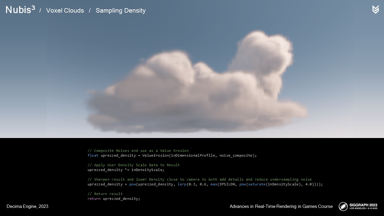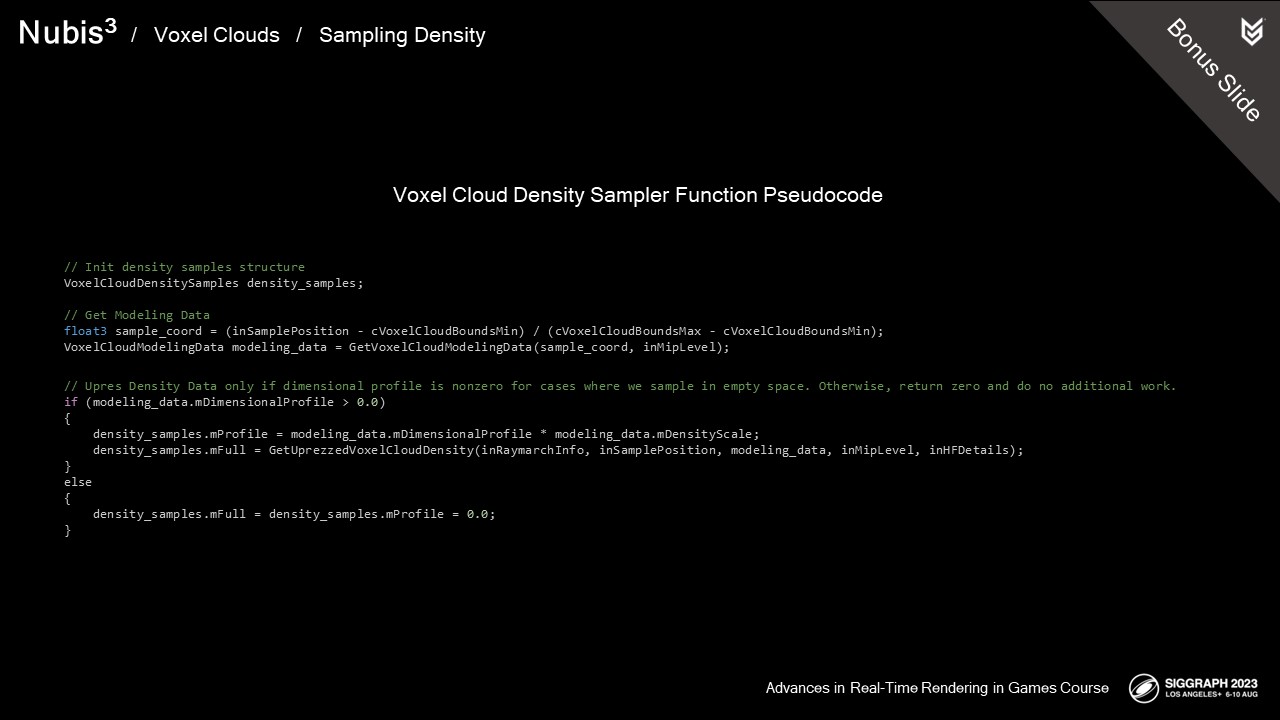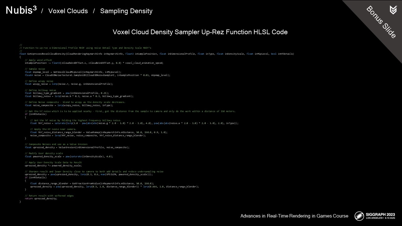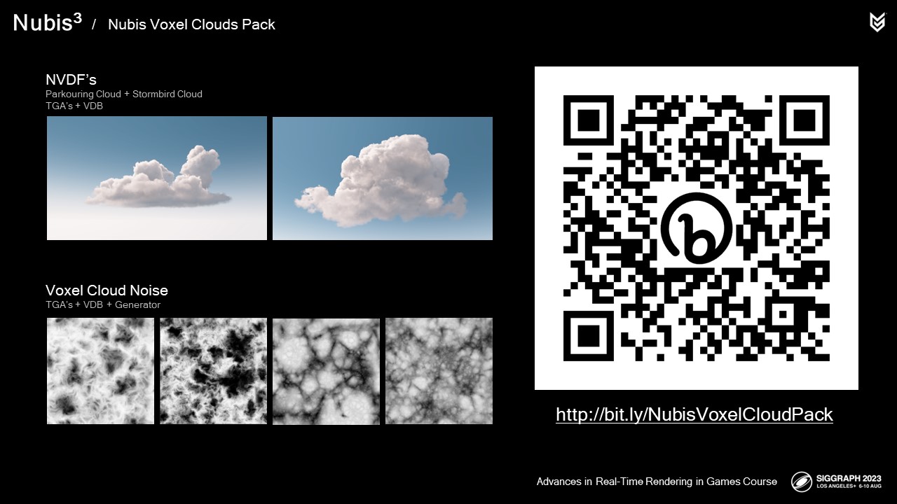 축하하는 의미에서 우리가 직접 디자인한 DLC를 준비했습니다. 게임에서 클라우드의 해상도를 높이기 위해 사용한 3D 노이즈의 TGA 및 VDB와 함께 두 개의 복셀 클라우드 NVDF를 TGA 슬라이스 및 VDB 파일 형태로 패키지화했습니다. 또한 이 노이즈에 대한 제너레이터도 후디니 디지털 에셋 형태로 포함했습니다. 이 외에도 프레젠테이션이 온라인에 공개되면 프로덕션에 사용된 실제 코드와 일부 주제에 대한 추가 설명이 포함된 몇 가지 보너스 슬라이드를 찾을 수 있습니다.
